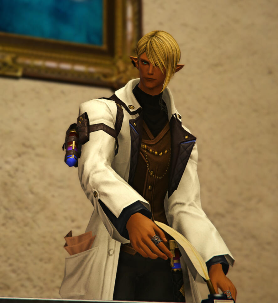 Despite his best efforts, Anias often finds himself in the local clinic providing routine care for the denizens of Sharlayan. That's not to say he doesn't insist his students do most of the actual examinations.Dr Vidoux does keep a roster of more complex patients for himself. Patients who require the utmost discretion, including a colleague or two.